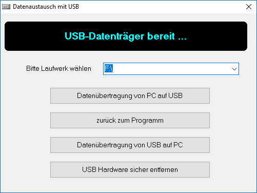 wählen Sie mit der Auswahlbox den Laufwerkbuchstaben Ihres USB-Sticks Klicken Sie dann auf Datenübertragung von USB auf PC Jetzt sind alle Ihre Daten auf dem neuen PC | |