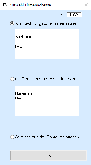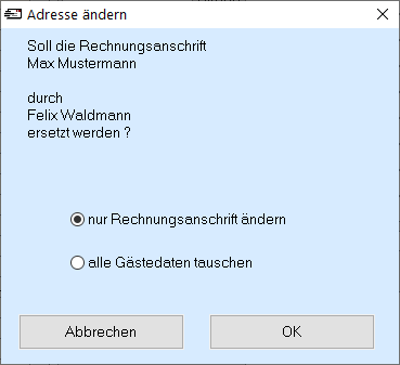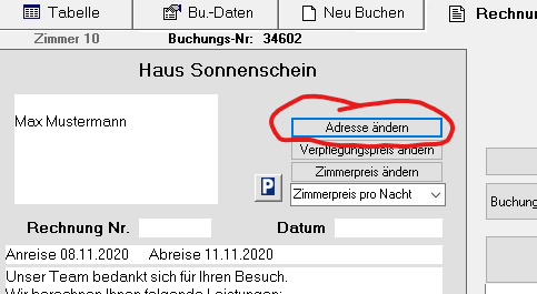 Klicken Sie im Rechnungsbereich auf „Adresse ändern“ , gelangen Sie in die Gästeliste. Hier können Sie entweder einen vorhandenen Gast wählen oder einen neuen Gast anlegen und diesen dann übernehmen.