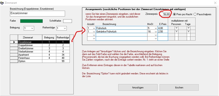 Für den Fall, dass Sie Ihr Frühstück splitten müssen (Frühstück 5%, Getränke 16%), gehen Sie bitte wie auf dem Bild vor: Einstellungen - Stammdaten - allgemeine Vorgaben - Zimmerart ändern Die zusätzlichen Zeilen werden nur bei der Buchung übernommen, wenn der Zimmerpreis oben rechts eingegen ist